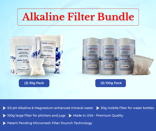 Alkaline Anytime Filter Bundle: Weltbestes alkalisches Wasser - 3 Packungen mit 30 g und 3 Packungen mit 100 g, passen in jeden Behälter -9,5 pH + ionisierte Elektrolyte